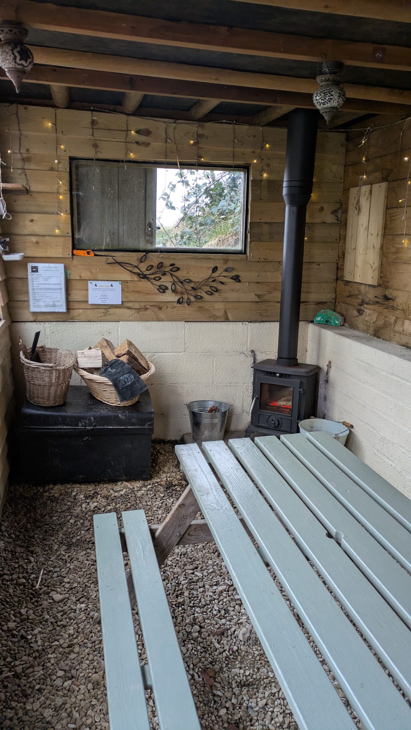 • Purpose built fully enclosed Dining Cabin with picnic bench, wood-burner, fridge, fairy & electric lighting & power points